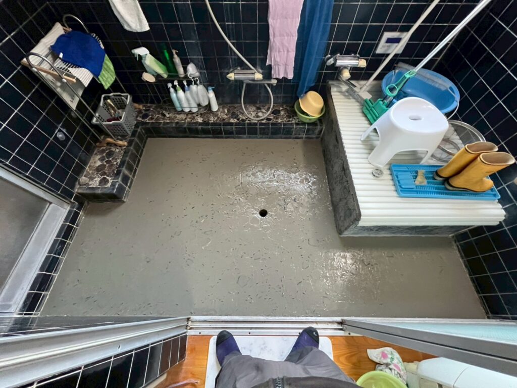 床のタイルにパテを打ち、平らにならしてから